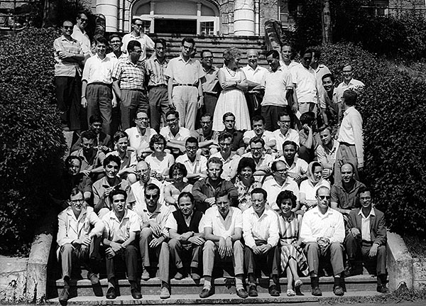Figure 1. Participants at the 1962 NATO summer school of theoretical physics posed for this group portrait at Robert College, Istanbul, Turkey. Feza Gürsey is seated at the right end of the first row; I’m just to his right, and Louis Michel is two spots to my right. In the second row, Eugene Wigner is third from the left, and Giulio Racah is third from the right. Sheldon Glashow is second from the left in the top row, and Sidney Coleman is eighth from the left.