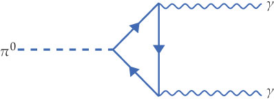 Figure 2. The decay of a neutral pion into two photons involves virtual quarks, the entities depicted with arrows in this Feynman diagram. Because quarks come in three colors, the measured decay amplitude is thrice what it would be in a theory with colorless quarks.