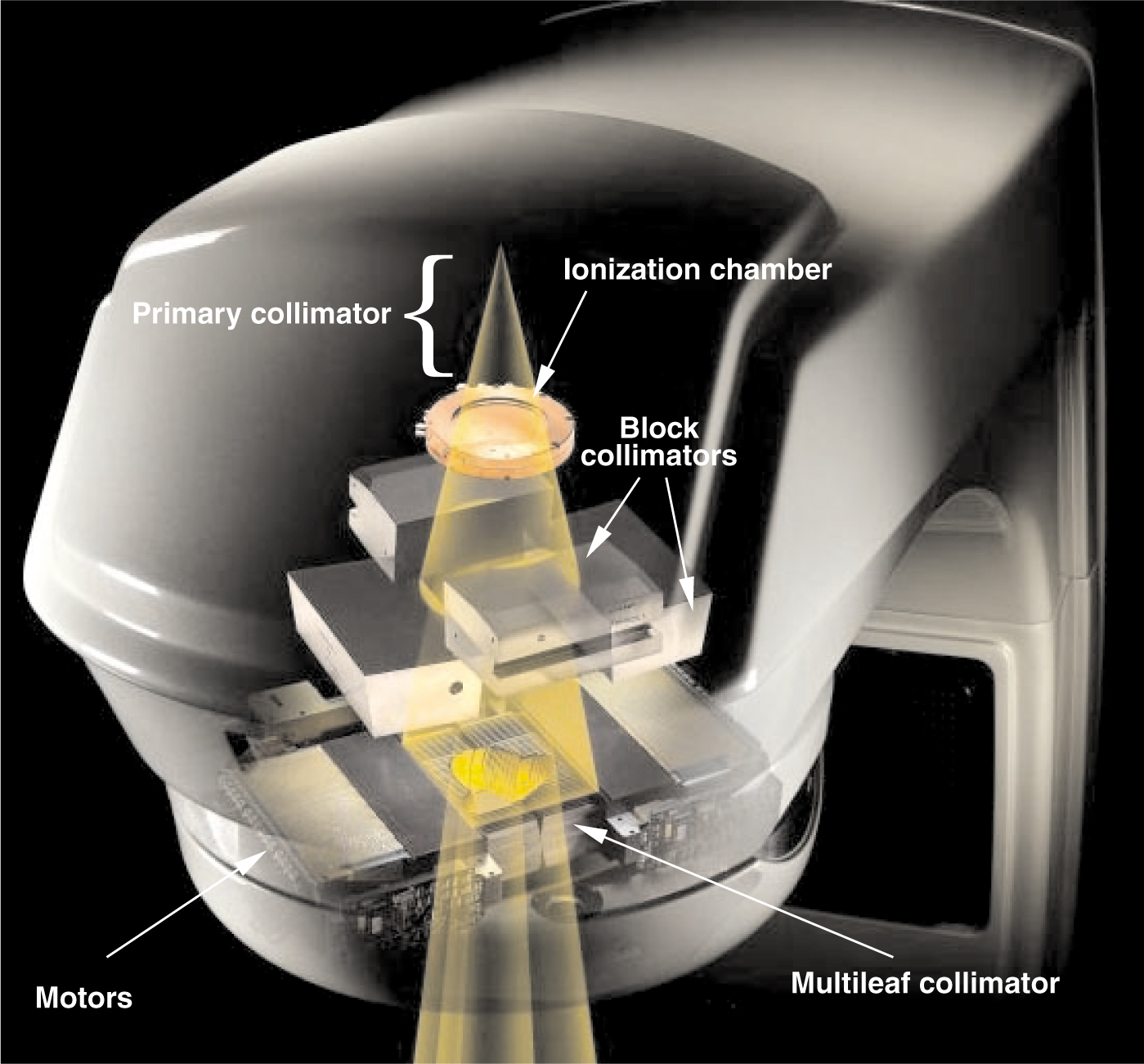 X-ray beam shaping. Within the gantry assembly (gray), brehmsstrahlung x rays produced by high-energy electrons incident on a tungsten target are restricted to a cone by the primary collimator, the shielding around the target, and the bending magnet. An ionization chamber immediately below the primary collimator produces current that is integrated and digitized to control the treatments. Motorized block collimators reduce the field to a rectangle that circumscribes the irradiation area. The leaves of the multileaf collimator (located about 50 cm below the tungsten target) are positioned by individual motors controlled by a digital system to fine-tune the shape of the field.