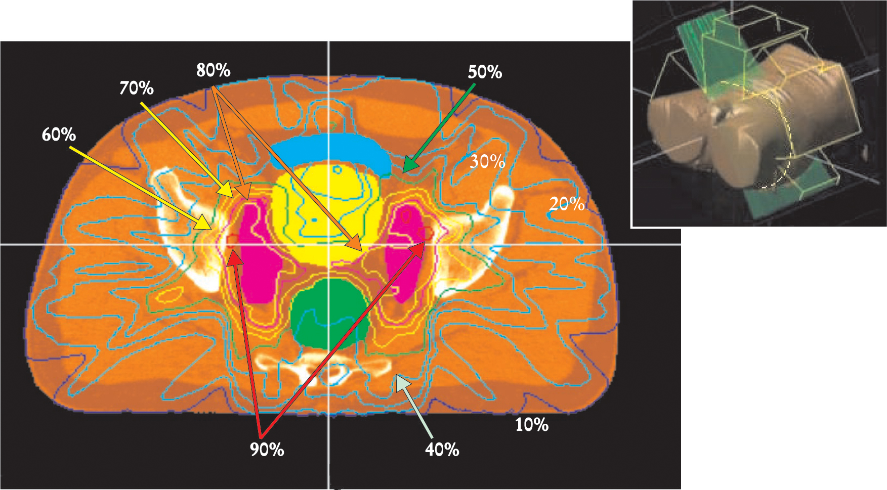 Visualizing 3D dose distributions is difficult. Within a 2D slice, however, isodose lines can be drawn through points of equal dose to characterize the dose distributions within a single plane. For example, figure 5 shows the dose distribution in a clinical application of IMRT for treating the prostate gland. The prostate is in a difficult position to treat with radiation. It is situated beneath and behind the bladder, an organ whose inner lining becomes inflamed at a radiation dose that depends partly on the area being exposed. The rectum, whose inner walls are particularly sensitive to radiation, lies immediately behind the prostate. Prostate cancer tends to spread along lymph vessels that radiate sideways from the prostate toward the walls of the pelvis and proceed up out of the pelvis into the abdomen, where they pass beside and in front of the sacrum, behind the large and small bowel, and up to the lower lumbar vertebrae. Irradiating this complex, inverted-Y volume while sparing the bowel, bladder, and rectum would not be feasible without IMRT. With IMRT, as figure 5 shows, the sensitive tissues can be largely avoided.13
