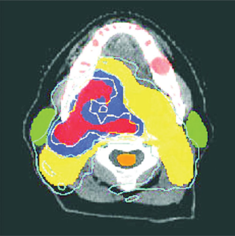 IMRT treatment in the head for a tumor at the base of the tongue and right tonsil. This CT reconstruction plane shows the base of the head from below; the white arc is the lower jaw. The colored regions are cross sections through the planned treatment target volumes, identified from positron emission tomography (PET) and contrast-enhanced CT. In the red region, the PET scan showed high oxygen deficiencies, which indicates tumor cells. The 80-gray isodose line (1 Gy = 1 J/kg) surrounding this region shows that the region received a dose of 80 Gy or higher. The contrast-enhanced CT scan indicated possible growth of tumor cells into the blue region. The IMRT delivered 70 Gy to this region. The yellow target was formed to account for known patterns of spread into lymph nodes; that area received a dose of 50 Gy. The parotid glands (green) were spared the higher doses and will continue to function to produce saliva. The spinal cord (orange) was shielded to receive lower that 35 Gy, safely below the dose that can cause neural damage.