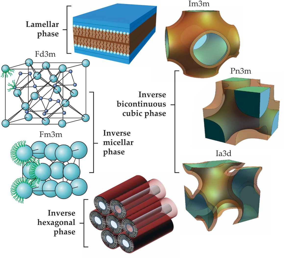 The bicontinuous cubic phases are composed of two sets of water channels separated by curved bilayers in the 3D space such that every point on the bilayer midplane surface is a saddle point with a zero-mean curvature. 2 Those bilayers encompass a system of aqueous channels and form structured yet flexible networks that are nonbirefringent and optically transparent. Specifically, lipid molecules in bicontinuous cubic phases form a highly curved continuous bilayer that separates the two interpenetrating but nonintersecting aqueous channel networks. The structures can display a double gyroid (Ia3d, with threefold connectivity of aqueous channels), double diamond (Pn3m, with fourfold connectivity), and primitive (Im3m, with sixfold connectivity) symmetry. 3 Finally, the inverse micellar phase comprises spheroidal micelles arranged in Fd3m or Fm3m symmetry, or in a disordered state L2. Most lipids do not show those phases in pure water and need oil-based components, such as oleic acid or limonene, to form the micellar cubic phase.