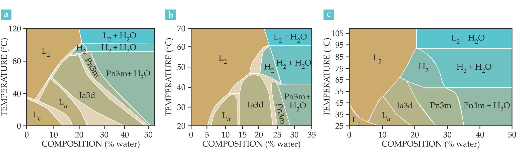 The phase diagrams of the lipids (a) monoolein, (b) phytantriol, and (c) monolinolein show the different structures each can form at thermodynamic equilibrium for different water compositions. Two symmetries are possible for the lamellar phase: the crystalline lipid tail form LC, also known as Lβ, and the amorphous lipid tail form Lα; three for the inverse bicontinous cubic phase (Ia3d, Pn3m, Im3m); and three for the micellar cubic phase—Fd3m and Fm3m if the micelles are organized in a lattice and L2 if in a disordered state. (Adapted from ref.