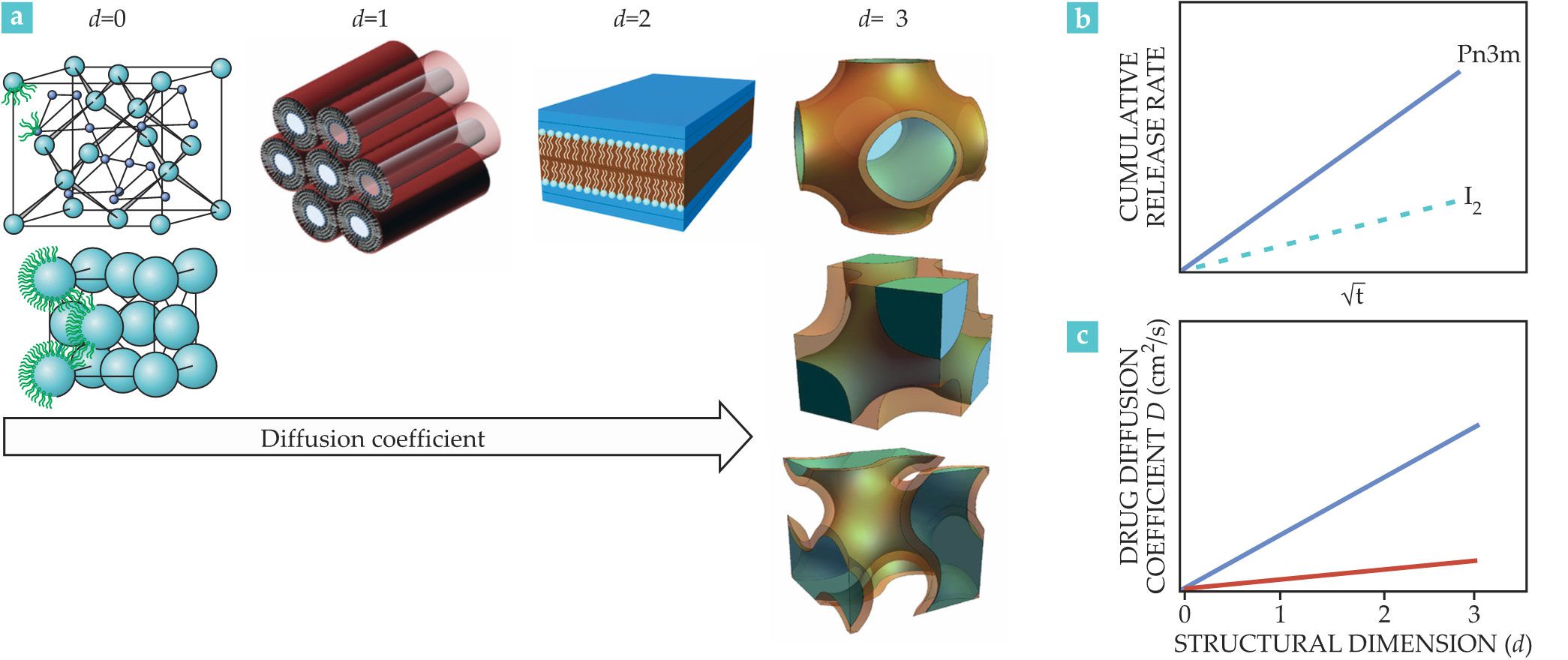 In the micellar cubic mesophase, the drug is confined in the micelles with water domains of about 2 nm in diameter (d = 0). In a hexagonal phase, the molecules move through cylindrical water channels (d = 1), whereas in a lamellar phase they can move along the planar bilayers (d = 2). In bicontinuous cubic phases, the diffusion is a 3D process (d = 3) in which the mobility of embedded hydrophilic molecules is hindered only by the channel size—about 5 nm in diameter—and its tortuosity. In general, the diffusion coefficient of a hydrophilic drug decreases with the dimensionality of the phase. Therefore, the Pn3m phases (d = 3) show the highest diffusion coefficients, whereas the micellar cubic phases (d = 0) show the lowest, as illustrated in figures