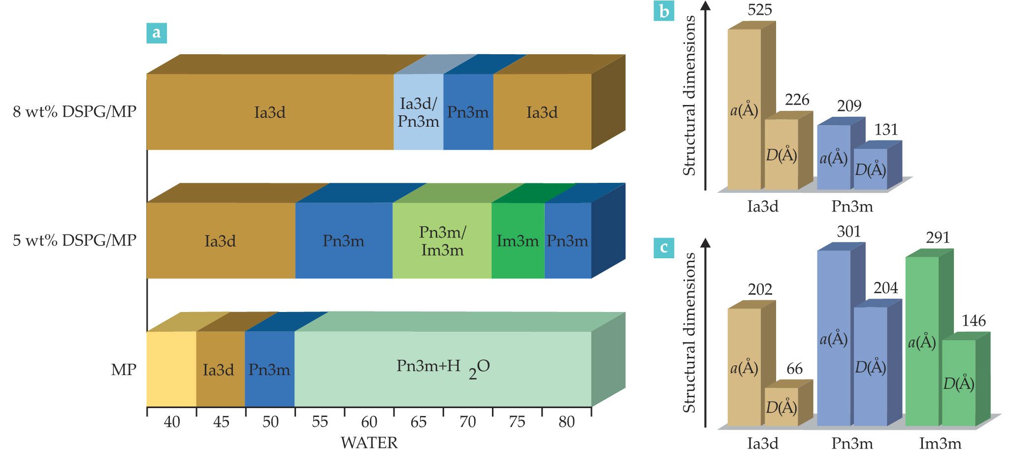Swollen lipidic mesophases transition from one structural phase to another with an increasing weight percent of water. (a) The bar graph shows how different combinations of a neutral lipid—monopalmitolein (MP)—and a charged lipid known as DSPG produce a unique range of mesophase structures. (b, c) The graphs on the right show how different percentages of DSPG and water swelling affect the structural dimension. The letters a and D stand for lattice parameter and diameter of aqueous channel, respectively. (Adapted from ref.