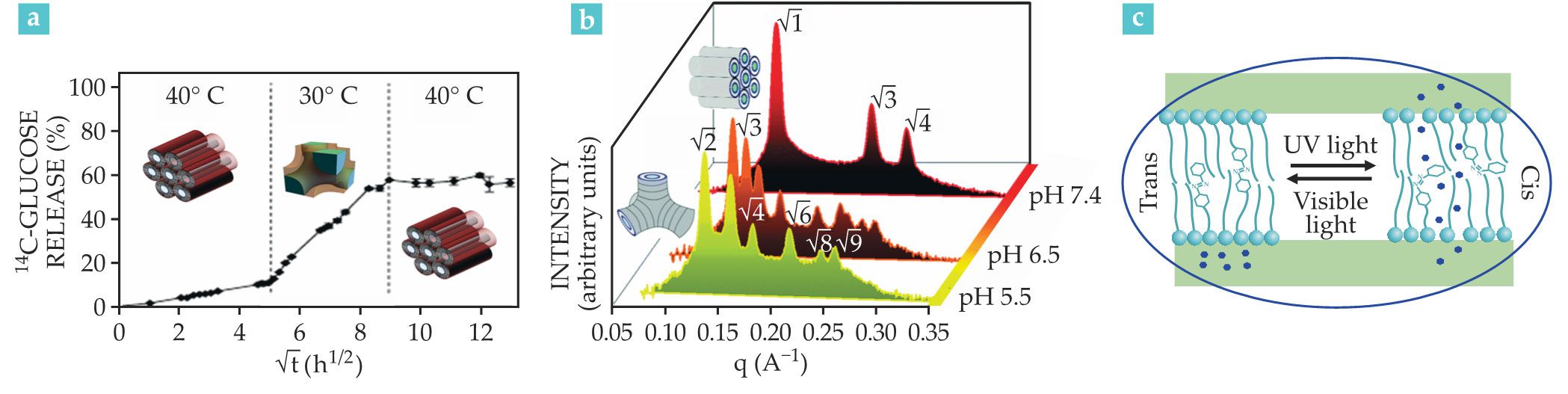 Environmental stimuli can trigger a lipidic mesophase to release the drug cargo it’s carrying. (a) Compared with a lipid mesophase system at 40 °C, the system at 30 °C that includes vitamin A releases glucose at a faster rate. (Adapted from ref.
