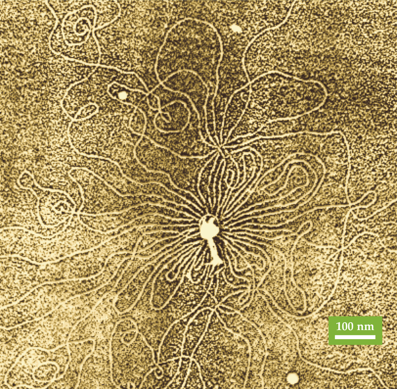 Figure 2. A T2 phage burst open as a result of osmotic shock. The electronmicroscope image was made when an intact phage was deposited on an air–water interface. The capsid acts like a rigid semipermeable membrane: It confines the DNA, but water and salt ions can pass through its pores. An osmotic pressure develops when water flows into the capsid in response to a high concentration of confined DNA. Eventually, the capsid ruptures and frees the DNA.