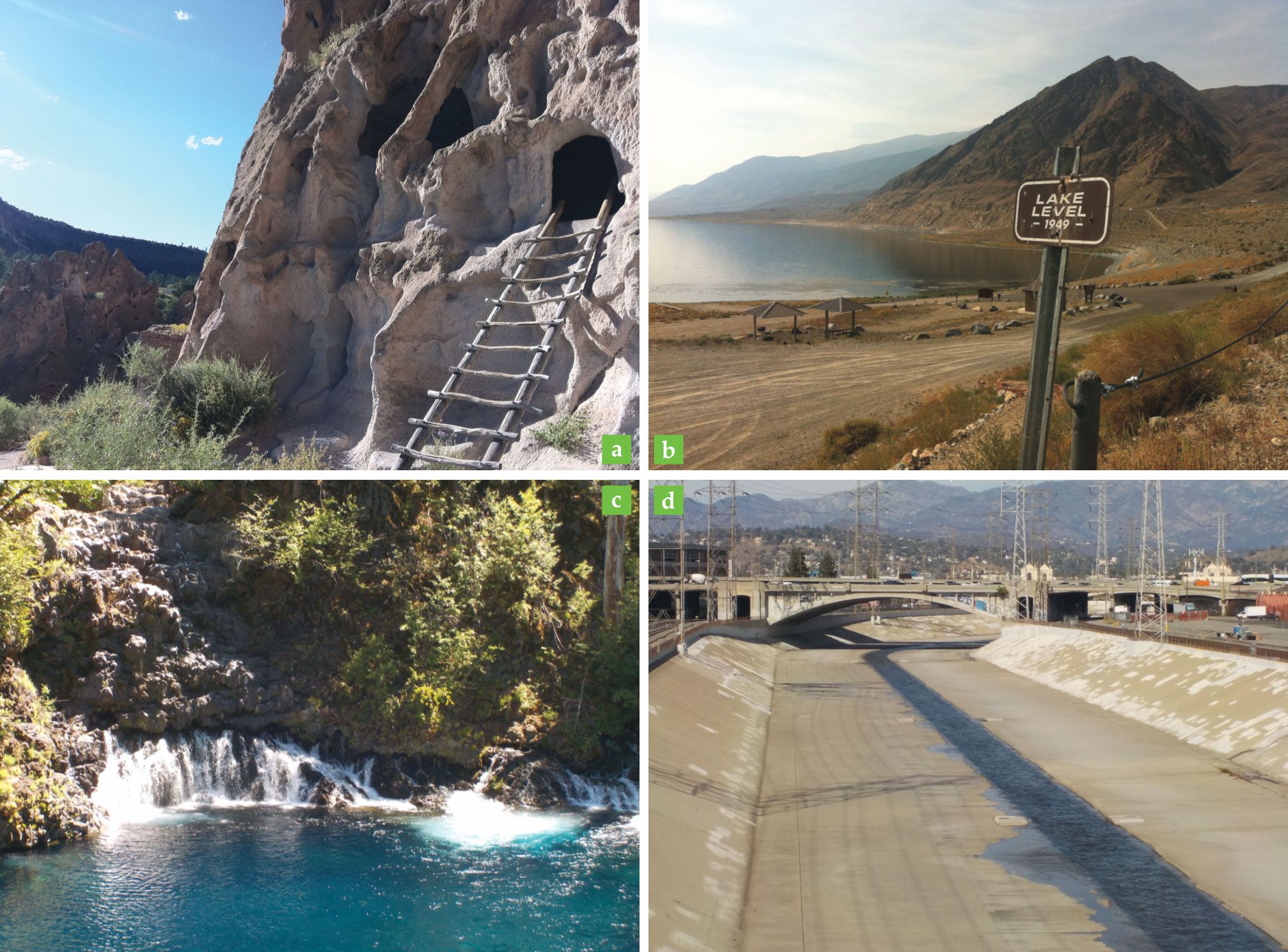 Rivers and other water resources evolve in response to natural and anthropogenic factors. (a) The advanced society that lived in Ancestral Puebloan (formerly known as Anasazi) ruins near Los Alamos, New Mexico, moved on around 1200 AD, in part because of the drying climate. (b) Nevada’s Walker Lake is a remnant of ice-age Lake Lahontan; its water level has dropped 55 m since the 19th century, mainly from diversions for agriculture. (c) The McKenzie River springs from a volcanic aquifer at Tamolitch Falls in the Oregon Cascades in a dramatic demonstration of river–aquifer interactions. Accurately capturing the water-storage effects can be crucial for river-flow forecasting. (d) The Los Angeles River is a favorite filming location for car chases in Hollywood movies. Such highly urbanized rivers no longer have the natural water storage and release mechanisms seen in the McKenzie River. They are therefore more variable and flood-prone, which makes accurate forecasting even more crucial—and more challenging. (Photos by Sean Fleming.)