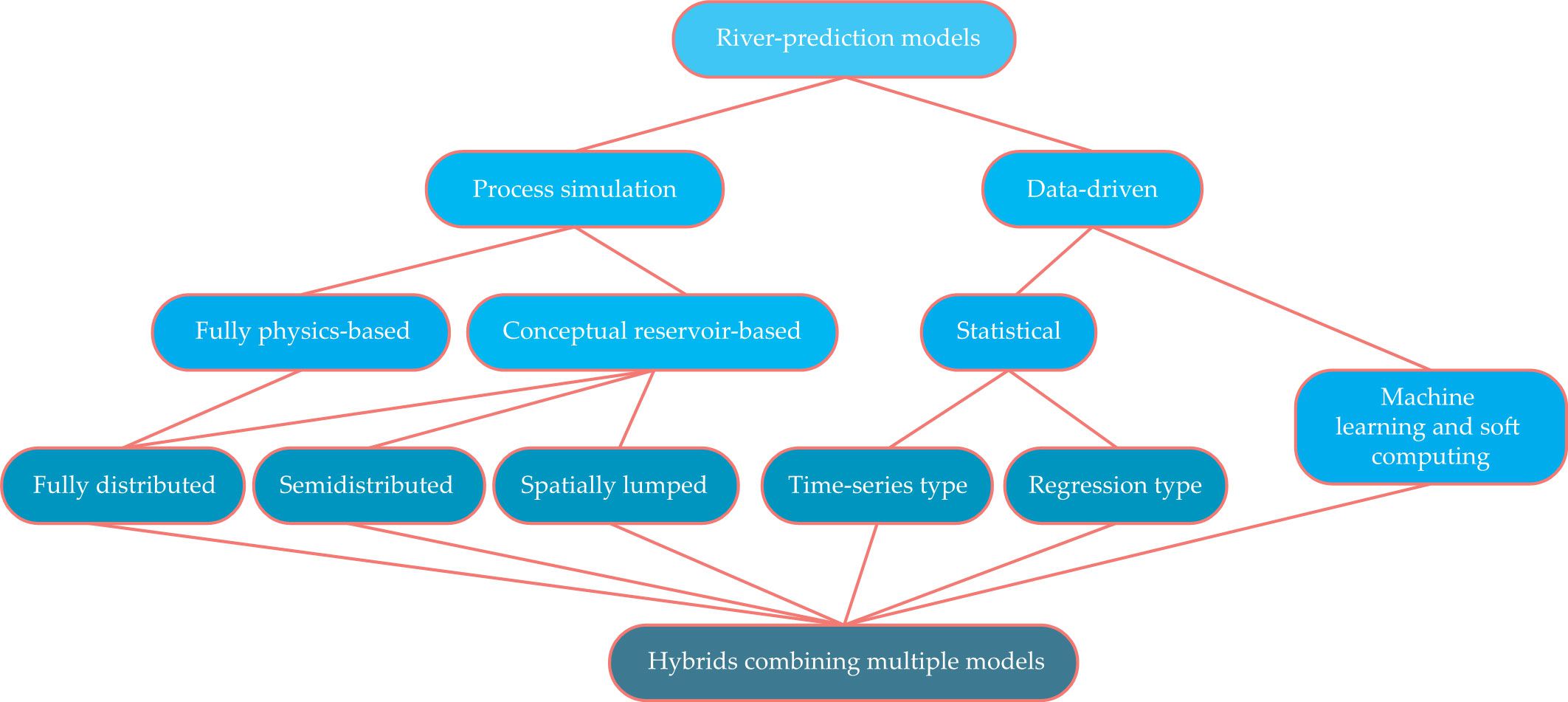 River-prediction models fall broadly into two categories. Process-simulation models aim to be explicitly physics-based and are further classified by their rigor, their level of spatial resolution, and the geophysical and biophysical processes they include. Data-driven models use pattern-detection algorithms to implicitly capture the physics of river runoff generation. They relate predictors to outputs using some form of input–output mapping and are further categorized by their use of classical statistics or artificial intelligence. There is much overlap among the modeling types, and there are many opportunities to combine them.