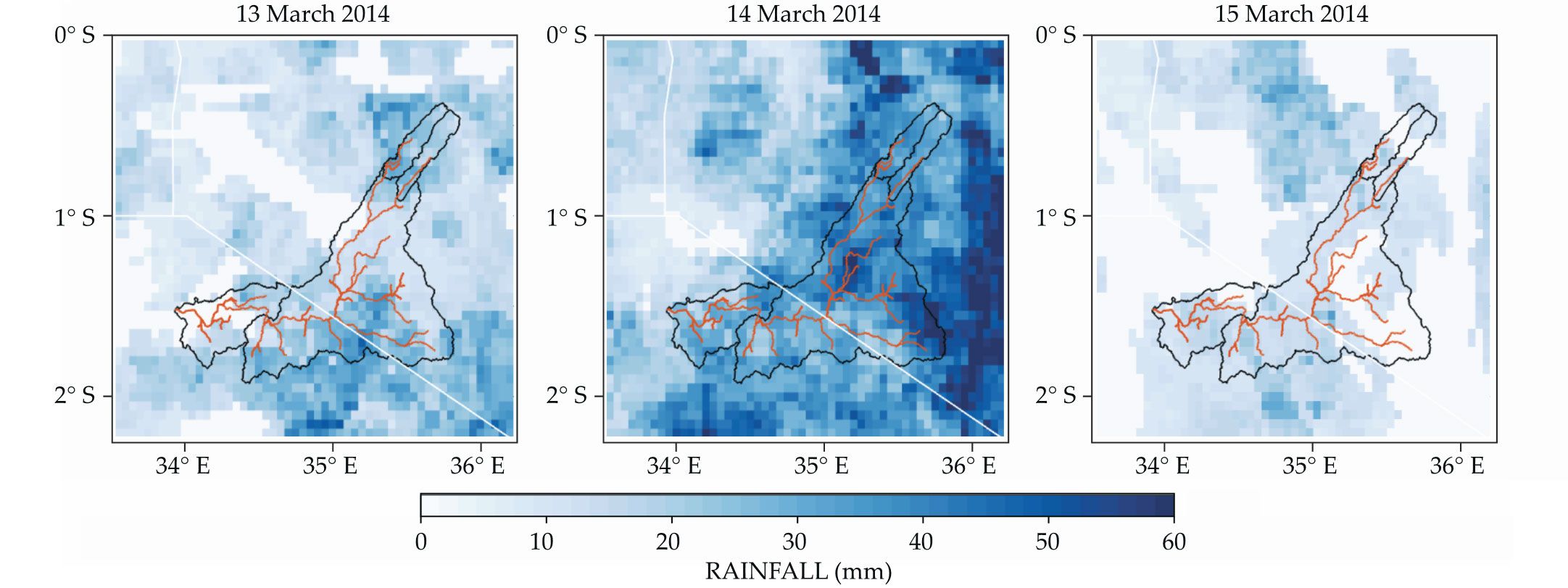 Rainfall in the Mara River basin is tracked by satellite and ground-based measurements and incorporated into the Climate Hazards Group Infrared Precipitation with Stations (CHIRPS) dataset for the region. These maps show daily CHIRPS precipitation; black, orange, and white lines denote, respectively, the watershed boundary, stream network, and Kenya-Tanzania-Uganda borders. Tirthankar Roy and colleagues at the University of Arizona (including one of us, Gupta) combined several satellite-based precipitation products, including CHIRPS, with an ensemble of hydrologic models to provide real-time probabilistic streamflow monitoring and forecasting for the Mara River.