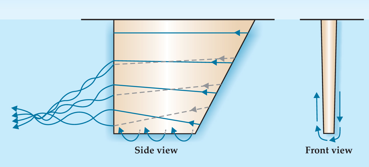 As a boat moves through water, it creates a bow wave that moves with the speed of the boat. Water waves are dispersive; long waves propagate faster than short ones. Therefore the length of the full wave generated by the bow is determined by the boat’s speed. As a boat starts to move slowly through the water, one sees at first a number of wave crests and troughs moving down the side of the hull. As the boat speeds up, the wavelength gets longer and one sees fewer waves down the side. Eventually at some speed, the wave will be long enough so that there’s just one wave down the side of the boat, with its crest at the bow, a trough in the middle, and another crest at the stern (see figure 4). That’s called the hull speed.