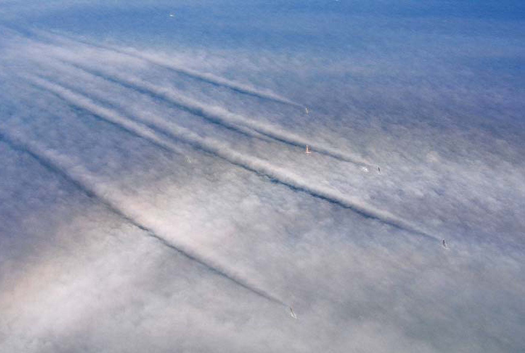 Figure 3. Sailtops form vortices visible in fog. The boats were participating in the 2001–02 Volvo Ocean Race off Cape Town, South Africa.