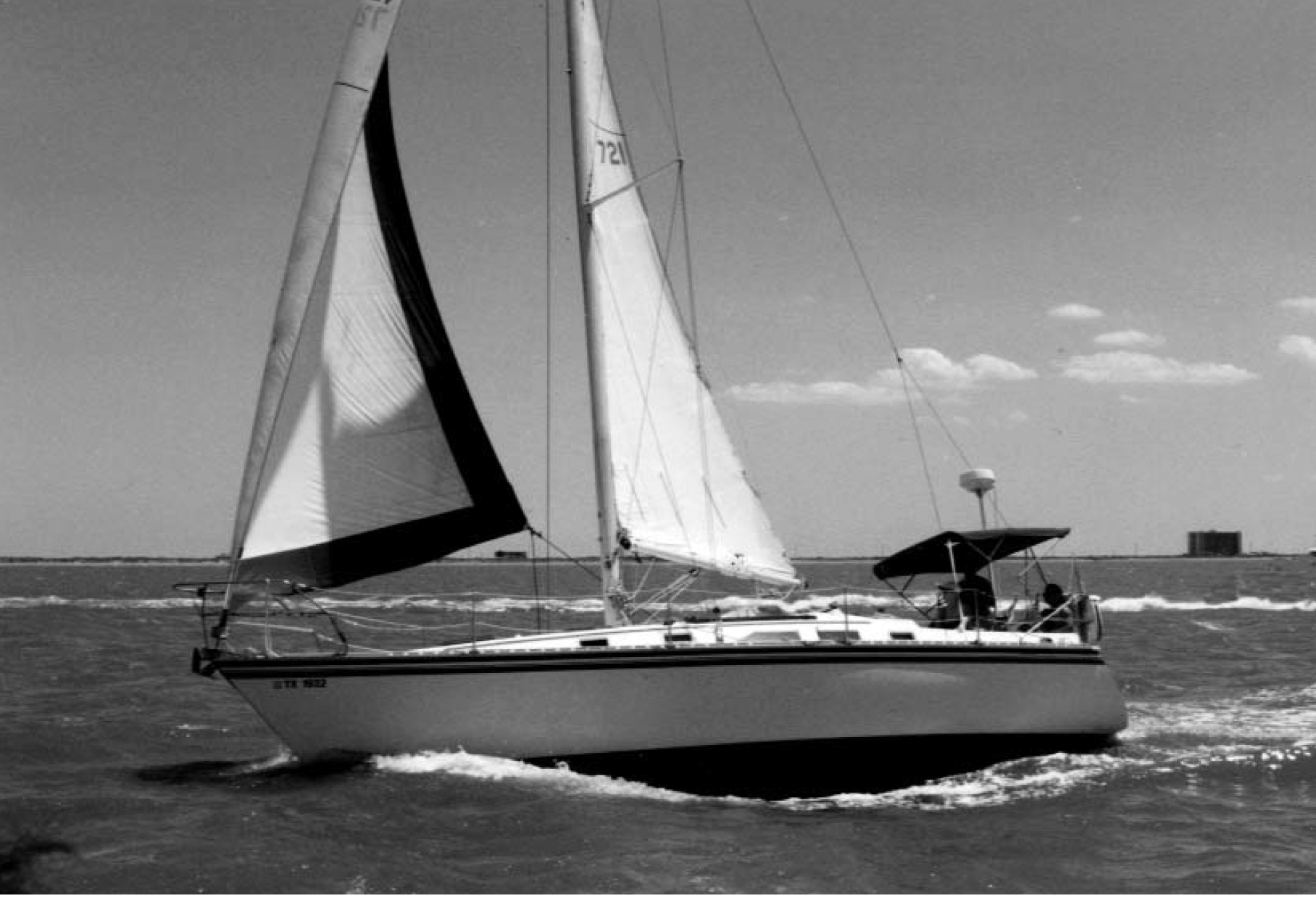 Figure 4. Moving at hull speed, a sailboat generates a bow wave whose wavelength just equals the length of the boat’s water line. The wave crests at bow and stern, with a single well-formed trough in between.
