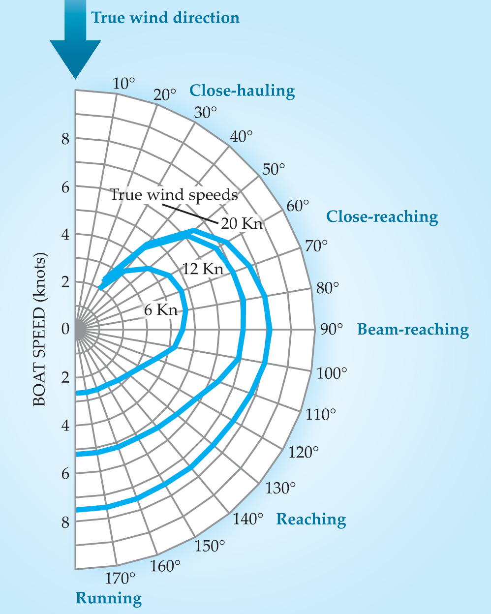 The figure shows the calculated boat speed as a function of wind speed and point of sail. The predicted boat speeds are greatest when one is sailing about 90° away from the wind direction. Sailors call that beam reaching. It yields a boat speed of about half the wind speed.