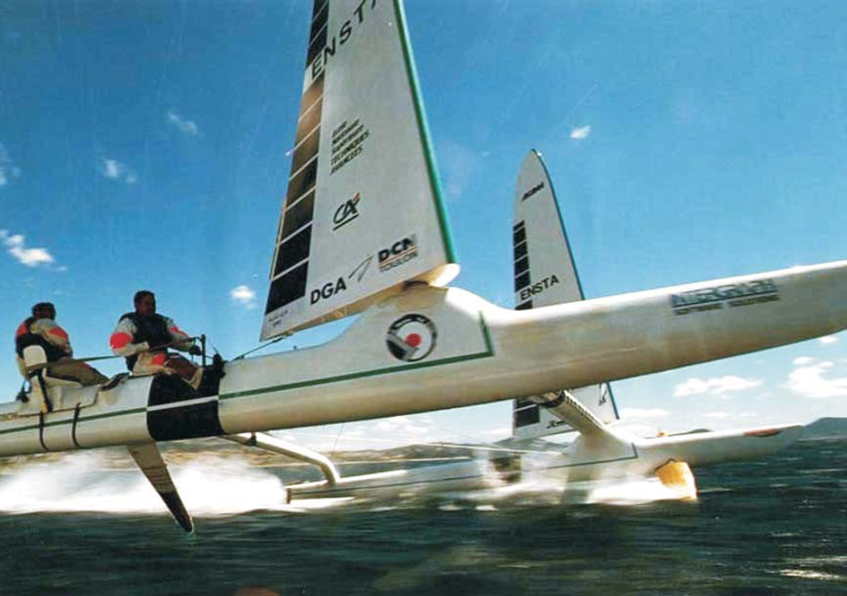 Figure 6. A hydrofoil sailboat with solid, winglike sails, moving at about twice the wind speed with the wind abeam—that is, blowing from the side.