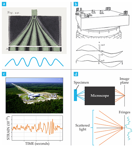 Figure 1. Highlights in interferometry. (a) Thomas Young’s 1803 two-slit interference experiment laid the foundations for the wave theory of light. (Adapted from ref.