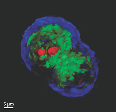 Figure 4. Label-free tomography of a colon cancer cell. The false color rendering (red, nucleoli; green, nuclei; purple, membrane) was obtained by combining 140 two-dimensional slices imaged by spatial light interference microscopy. (Adapted from ref.