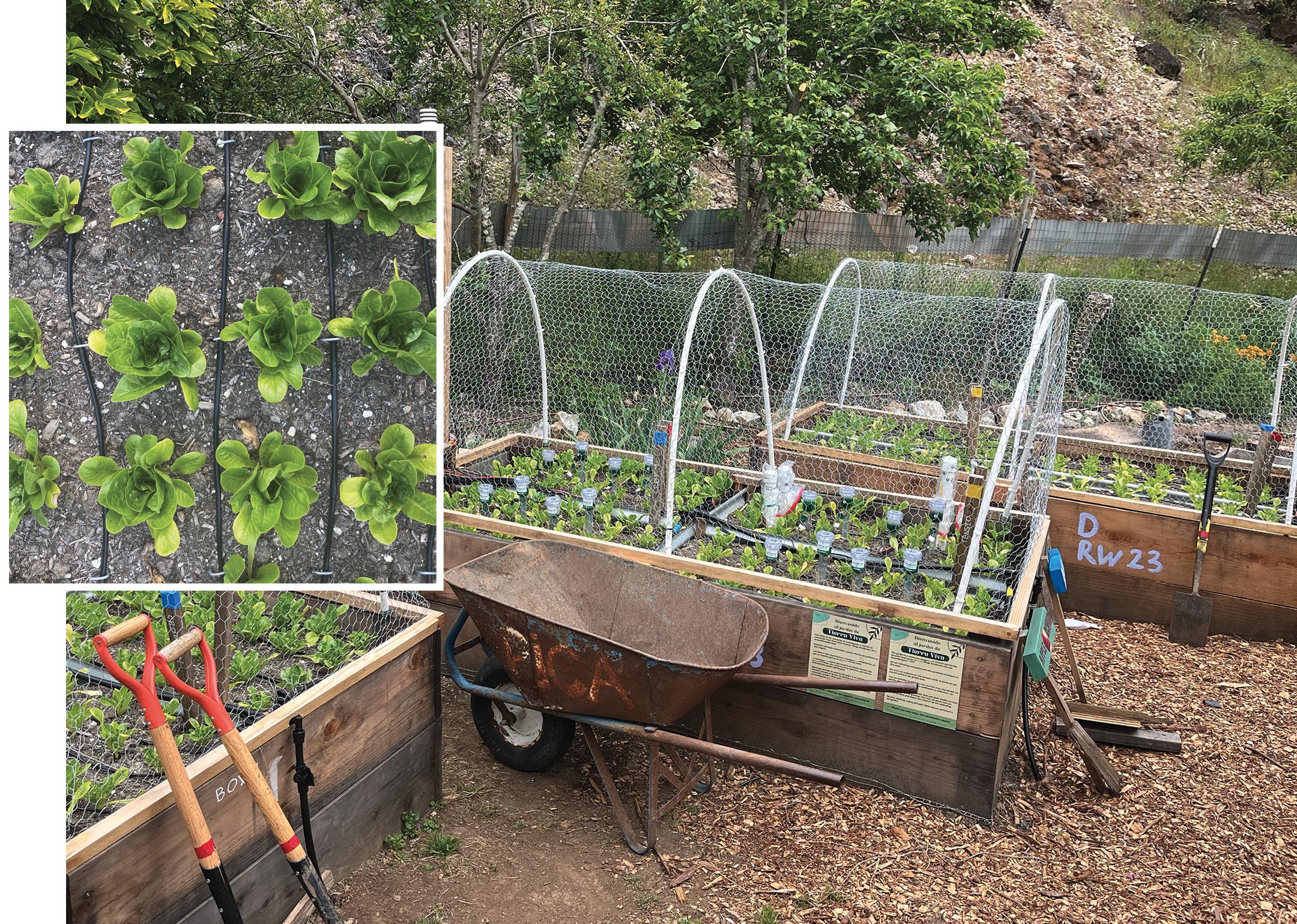 Food sustainability, rainwater capture, and composting are among the directions that Alexie Leauthaud is pursuing as she expands her research to focus on adaptation to climate change. The images show the campus site of her experiments, which include studying how to optimally irrigate lettuce with rainwater. (Courtesy of Alexie Leauthaud.)