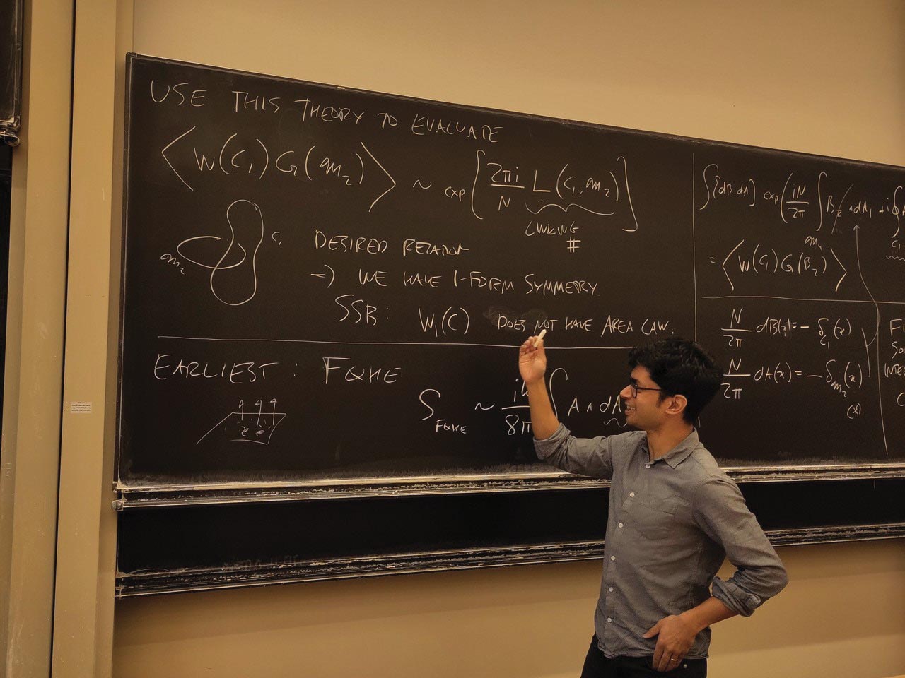 Nabil Iqbal lectures on generalized global symmetries at a school on quantum field theory and holography held last February at the Institute for Theoretical Physics in Jena, Germany. A Simons Foundation Pivot fellow, Iqbal is spending this academic year exploring machine learning with his Pivot mentor Erik Bekkers at the University of Amsterdam. (Courtesy of Katharina Wölfl.)