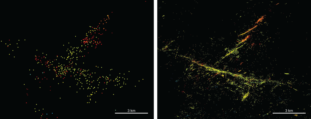 Earthquake detection from seismological data has been vastly improved by the application of deep-learning algorithms. Earthquakes from the 2016 magnitude 5.8 swarm near Pawnee, Oklahoma, are represented as individual points, color coded by time of occurrence, with yellow representing earlier quakes and red representing later ones. The US Geological Survey Advanced National Seismic System Comprehensive Earthquake Catalog (left) contains earthquakes that were directly measured by standard seismological methods. A deep-learning-based earthquake catalog