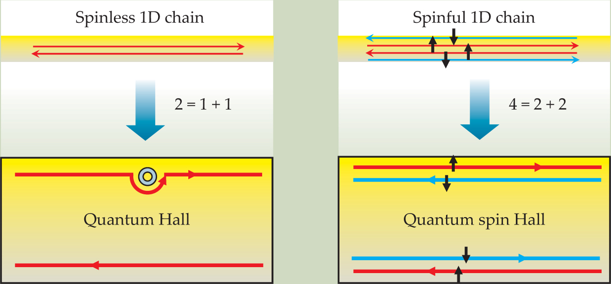 Figure 1. Spatial separation is at the heart of both the quantum Hall (QH) and the quantum spin Hall (QSH) effects. (a) A spinless one-dimensional system has both a forward and a backward mover. Those two basic degrees of freedom are spatially separated in a QH bar, as illustrated by the symbolic equation “2 = 1 + 1.” The upper edge contains only a forward mover and the lower edge has only a backward mover. The states are robust: They will go around an impurity without scattering. (b) A spinful 1D system has four basic channels, which are spatially separated in a QSH bar: The upper edge contains a forward mover with up spin and a backward mover with down spin, and conversely for the lower edge. That separation is illustrated by the symbolic equation “4 = 2 + 2.”