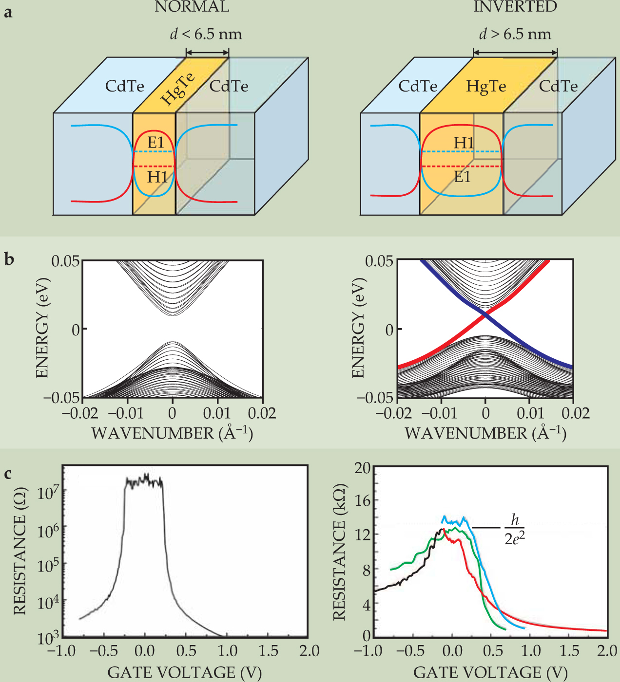 Figure 3. Mercury telluride quantum wells are two-dimensional topological insulators. (a) The behavior of a mercury telluride–cadmium telluride quantum well depends on the thickness d of the HgTe layer. Here the blue curve shows the potential-energy well experienced by electrons in the conduction band; the red curve is the barrier for holes in the valence band. Electrons and holes are trapped laterally by those potentials but are free in the other two dimensions. For quantum wells thinner than a critical thickness d c ≃ 6.5 nm, the energy of the lowest-energy conduction subband, labeled E1, is higher than that of the highest-energy valence band, labeled H1. But for d > d c, those electron and hole bands are inverted. (b) The energy spectra of the quantum wells. The thin quantum well has an insulating energy gap, but inside the gap in the thick quantum well are edge states, shown by red and blue lines. (c) Experimentally measured resistance of thin and thick quantum wells, plotted against the voltage applied to a gate electrode to change the chemical potential. The thin quantum well has a nearly infinite resistance within the gap, whereas the thick quantum well has a quantized resistance plateau at R = h/2e 2, due to the perfectly conducting edge states. Moreover, the resistance plateau is the same for samples with different widths, from 0.5 µm (red) to 1.0 µm (blue), proof that only the edges are conducting.
