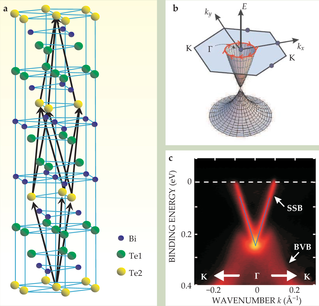 Furthermore, the group’s spin-resolved measurements showed that the electron spin indeed lies in the plane of the surface and is always perpendicular to the momentum, in agreement with theory. However, the experiments also observed bulk carriers coexisting with the topological surface states. A pure topological-insulator phase without bulk carriers was first observed in Bi2Te3 by Yulin Chen and Zhi-xun Shen’s group at Stanford in ARPES experiments on material prepared by Ian Fisher and colleagues.