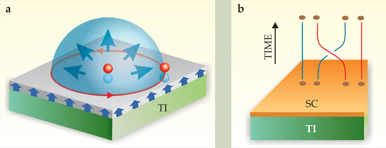 Figure 5. Novel behavior is predicted for topological insulators. (a) When a topological insulator (TI, green) is coated by a thin ferromagnetic layer (gray), each electron (red sphere) in the vicinity of the surface induces an image monopole (blue sphere) right beneath it.