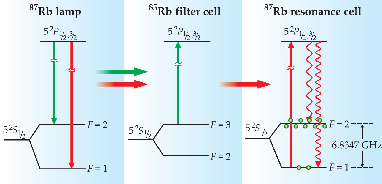 As illustrated in figure 2, a 87Rb discharge lamp emits light at frequencies that connect Rb’s excited states with each ground-state hyperfine level. Due to a coincidence of nature, spectral lines associated with 87Rb’s F = 2 state are nearly degenerate with those of 85Rb’s F = 3 state. Thus, as Peter Bender and colleagues explained in a 1958 Physical Review Letter, 2 a filter of 85Rb vapor can remove the F = 2 spectral component from a 87Rb lamp’s emission. When the filtered lamplight reaches the 87Rb atoms in the resonance cell, it preferentially excites atoms out of the F = 1 state. Decay from the excited state repopulates both hyperfine levels, but those atoms returning to the F = 1 state are excited again, so that after several absorption–decay cycles a nonthermal population distribution is created. The easy filtering of lamplight is the primary reason present-day vapor-cell clocks use Rb instead of other alkali metals.