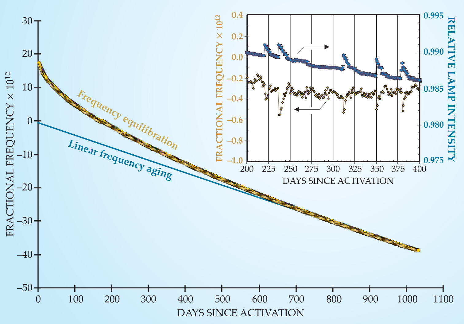 An important area of current research concerns the slow changes in a clock’s frequency over time. Figure 3 shows the frequency variations of a GPS satellite clock after it was turned on; its general characteristics are common to all rubidium clocks. Following activation the clock experienced a very slow exponential equilibration until it settled down to a linear frequency change with time. The mechanisms that drive those two processes are not yet understood. 10 The figure’s inset shows an expanded view around days 200 to 400, illustrating several slight frequency jumps that are correlated with small changes in the lamp’s output. There, the influence of the light-shift effect is evident—the intensity of lamplight in the resonance cell directly affects the clock frequency—but the cause of those small lamp changes is not yet known. Though not shown in the figure, the frequency of every Rb clock undergoes slight stochastic fluctuations. In the long term, those fluctuations correspond to Brownian-type motion, and again the physical process that drives them is not understood. Clearly, although the Rb clock has been studied for 50 years, much remains to be understood and improved.
