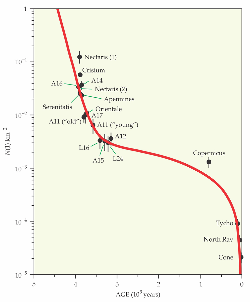Lunar chronology is based on the ages of lunar samples that represent surfaces on which impact crater size–frequency distributions have been determined. N(1) refers to the number of craters that are 1 km in diameter or larger, and the plot relates that number to the crater accumulation time. Numbered labels “A” and “L” refer to Apollo and Luna missions, respectively. Measurements of crater size and frequency distributions come from orbital photographs. (The method and plot are adapted from ref. 4; the age data are taken from ref. 5.)