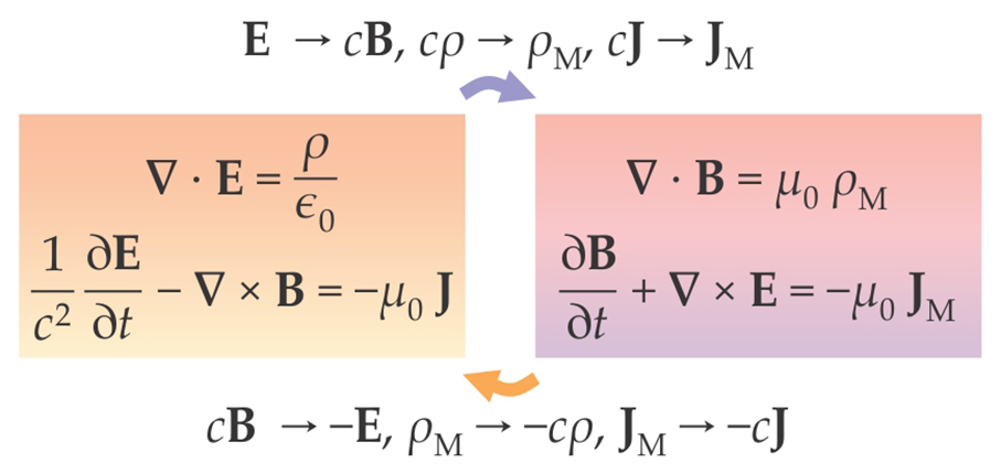 Figure 1. Maxwell’s equations of electrodynamics, amended to include magnetic monopoles. The terms on the right-hand sides of the equations at right arise due to magnetic monopoles. The arrows indicate transformations that obey duality symmetry. Here,