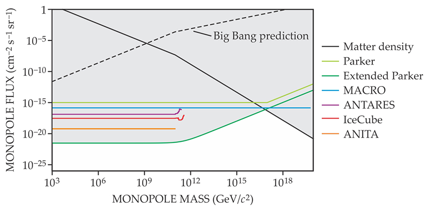 Cabrera’s result has since been cast into doubt by subsequent, more extensive searches that found no further candidate monopoles. 10 , 11 The MACRO experiment in Gran Sasso, Italy, ran from 1989 to 2000 and gave an upper bound on the monopole flux of 10−16 cm−2 s−1 sr−1 over a wide range of monopole masses, and the ANITA, ANTARES, and IceCube neutrino detectors have provided even stricter limits on relativistic monopoles (see figure 4). Researchers have also attempted to find monopoles trapped in polar rocks, moon rocks, and seawater and through the tracks they might leave in mica, all to no avail. Because of highly uncertain systematics, however, it is not possible to turn those studies into precise limits on the monopole flux. Some GUT monopoles are predicted to catalyze nucleon decay, and the effects on the interiors of white dwarfs, neutron stars, and even the Sun place strong bounds on their number density.