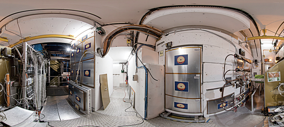 Figure 5. The MoEDAL experiment, pictured here in a panoramic photo, looks for monopoles and other exotic, highly charged particles in the debris of proton–proton collisions at CERN’s Large Hadron Collider. After a brief test run in 2012, the experiment began collecting data last year. (Image courtesy of CERN.)