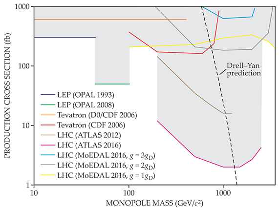 Figure 6. Collider experiments have placed upper bounds on the monopole production cross section, expressed here in conventional units of femtobarns (1 fb = 10−43 m2). With the exception of the MoEDAL test-run results, the observations apply to spin-½ monopoles with a single Dirac magnetic charge