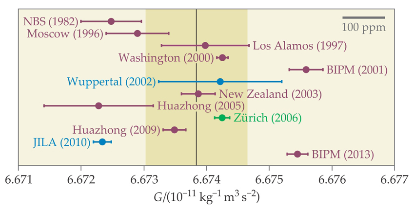 Figure 1. Measurements of Newton’s gravitational constant G have yielded conflicting results. Here, the results of torsion-balance (maroon), pendulum (blue), and beam-balance (green) experiments discussed in the text are shown, along with the location and year in which they were measured. Error bars correspond to one standard deviation; the shaded region indicates the assigned uncertainty of the value recommended by the Committee on Data for Science and Technology in 2010. (Adapted from T. J. Quinn et al., Phys. Rev. Lett.111, 101102, 2013, doi:10.1103/PhysRevLett.111.101102.)