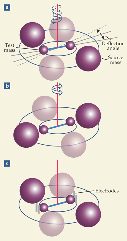 Figure 2. A torsion-balance experiment has, as its central element, two test masses balanced on a beam suspended by a thin metal wire. (a) In the original setup conceived by John Michell and later used by Henry Cavendish, two large source masses are positioned to exert a gravitational force that causes the torsion balance to turn through a small angle. The arrangements indicated by the dark and light source masses would yield clockwise and counterclockwise displacements, respectively. (b) In so-called time-of-swing experiments, G is calculated from the change in oscillation period when source masses are repositioned between arrangements lying along (dark spheres) and orthogonal to (light spheres) the resting test-mass axis. (c) In a third approach, the electrostatic servo-control technique, the gravitational force is calculated from the voltage that must be applied to nearby electrodes to hold the test assembly in place. In all three configurations, the gravitational coupling between the source masses and the whole of the torsion-balance assembly has to be calculated.