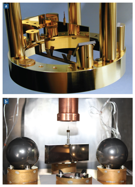 Figure 3. Two twists on the torsion balance. (a) A group at the University of Washington used the flat plate visible at center, rather than the traditional dumbbell arrangement, as the test mass in a torsion-balance measurement of the gravitational constant G. (A penny at the bottom left conveys the scale.) In such a geometry, the derived value of G is almost completely independent of the mass distribution of the test masses. (Image courtesy of Jens Gundlach.) (b) Researchers at Huazhong University of Science and Technology in Wuhan, China, used a quartz slab as the test mass, which offers similar metrology advantages. The source masses are arranged in the so-called time-of-swing configuration, detailed in figure 2b. (Image courtesy of Jun Luo.)