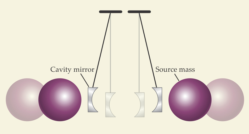 Figure 4. A simple pendulum gravity gradiometer consists of a microwave or optical cavity formed by two hanging mirrors. When source masses are moved toward the cavity mirrors, the varying gravitational pull leads to a change in the cavity’s optical length and, hence, a change in its resonant frequency. In a Fabry–Perot experiment performed at JILA, the change in the optical length was on the order of tens of nanometers.