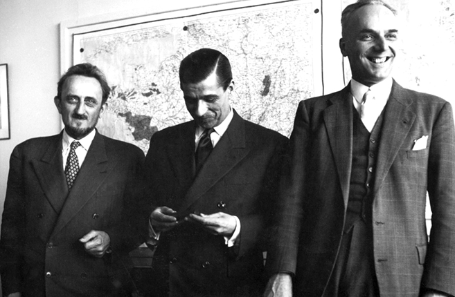 Figure 2. Uranium search in Morocco. Involved in the effort to find uranium in the African country were (left to right) Francis Perrin of France’s Atomic Energy Commission (Commissariat á l’Énergie Atomique, CEA); Georges Guille, in charge of France’s atomic energy matters; and Pierre Guillaumat, the CEA’s administrator general. (Image courtesy of the Archives of the Commissariat a l’Énergie Atomique.)