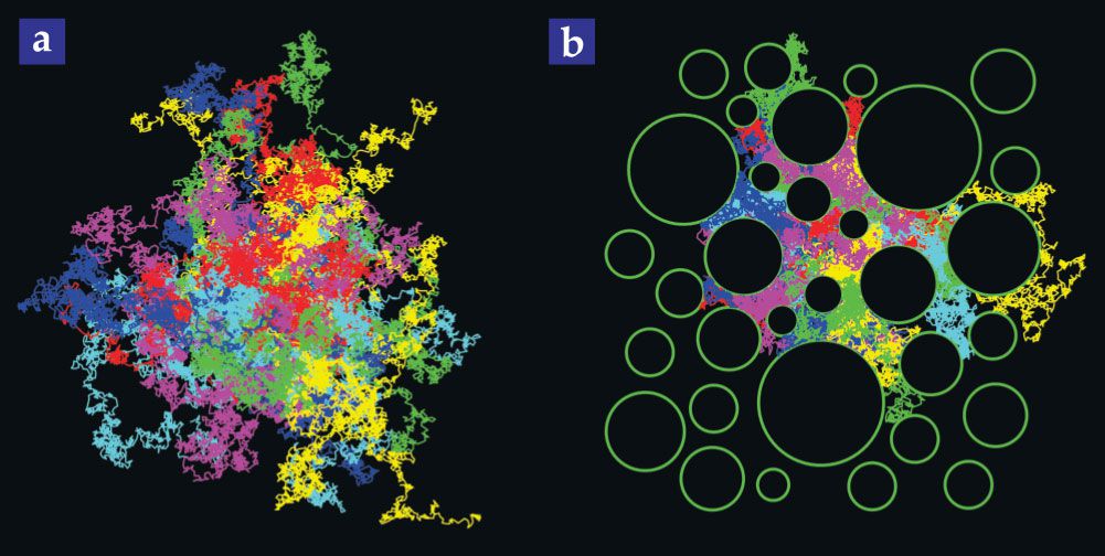 Random walks explain how probes diffuse through brains. In these simulated two-dimensional random walks, 50 particles start at the center of each image and take 1500 steps of equal size but in random directions either (a) unimpeded or (b) surrounded by circular obstructions that represent cells. Each of the 50 particle trajectories was assigned one of six colors. The particles spread farther in the absence of hindrance.