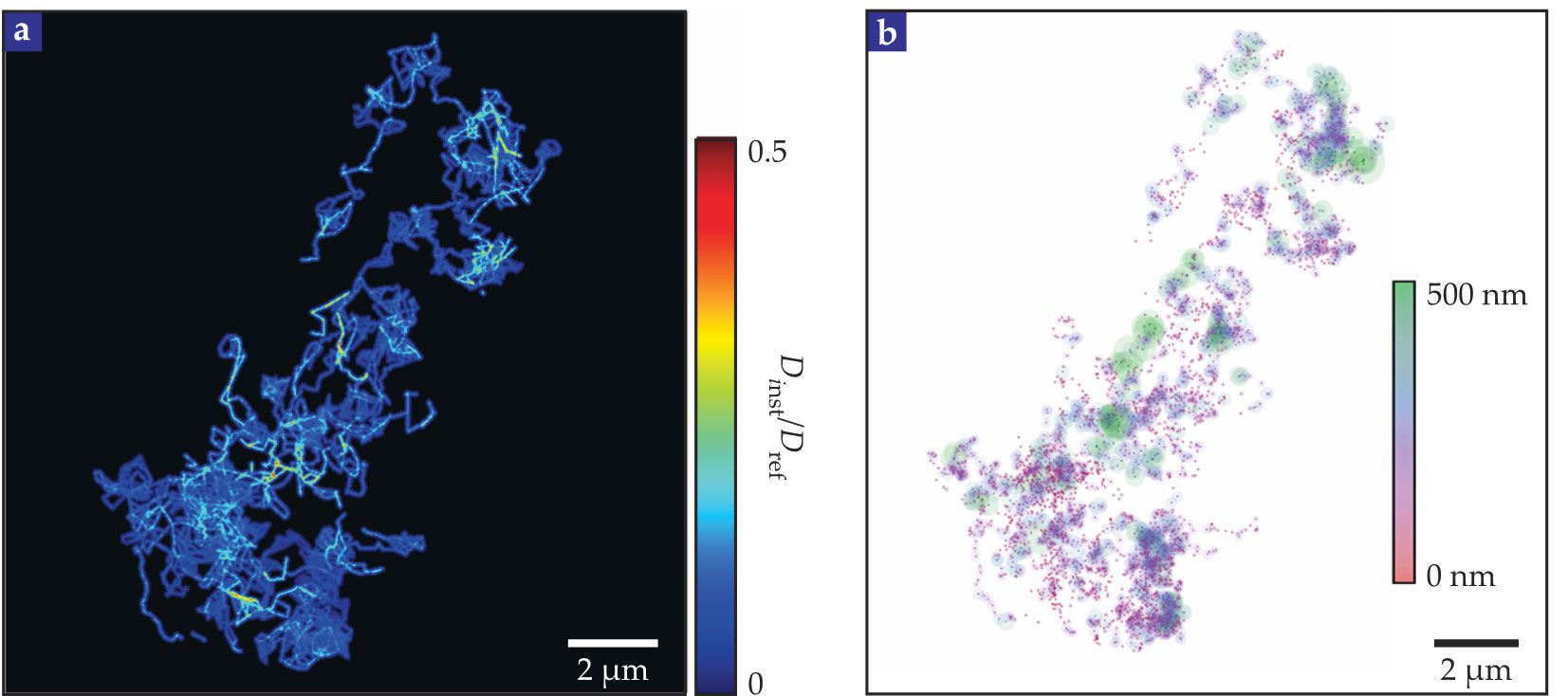 Single-particle tracking and superresolution imaging reveal the local structure of the extracellular space. (a) Single-walled carbon nanotubes diffuse through a living slice of an adult mouse’s brain with the instantaneous diffusion coefficients relative to unimpeded diffusion (