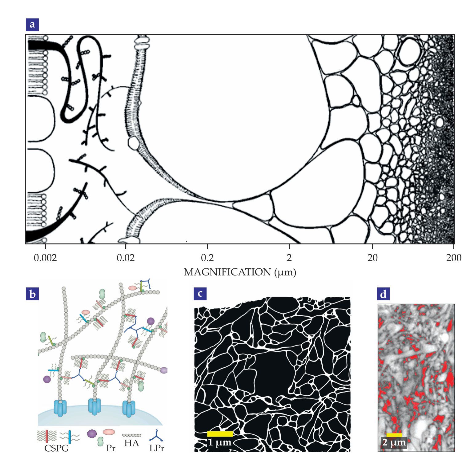 The extracellular space (ECS) looks different at various length scales. (a) Depicted logarithmically from high magnification (left) to low magnification (right), the ECS evolves from tendrils of extracellular-matrix molecules to the cell membrane’s lipid bilayer to whole cells. (Adapted from ref.