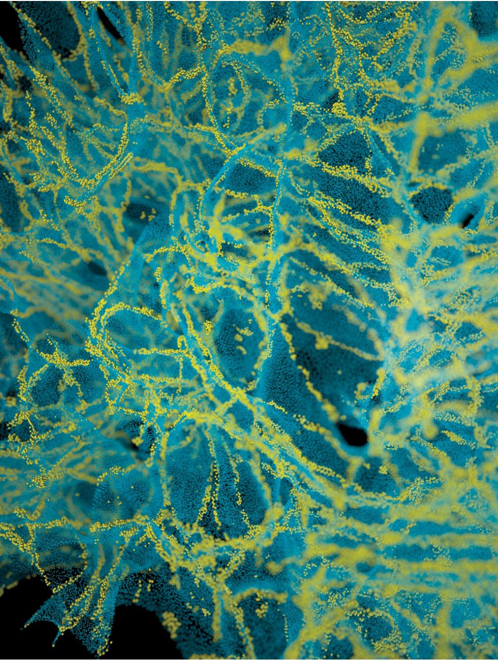 Where cities and the ECS part company is that the layout of cities is largely two-dimensional, whereas the ECS is three-dimensional. Electron microscopy and superresolution optical methods provide only a 2D picture. A 3D electron-microscopy reconstruction of brain tissue exists, but it does not preserve the width of the ECS. To account for that limitation, a computer algorithm reinflated the reconstruction, as shown in figure