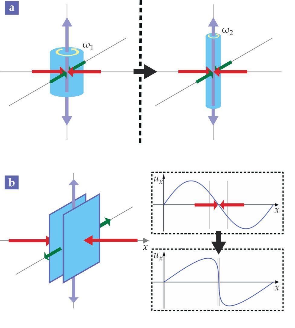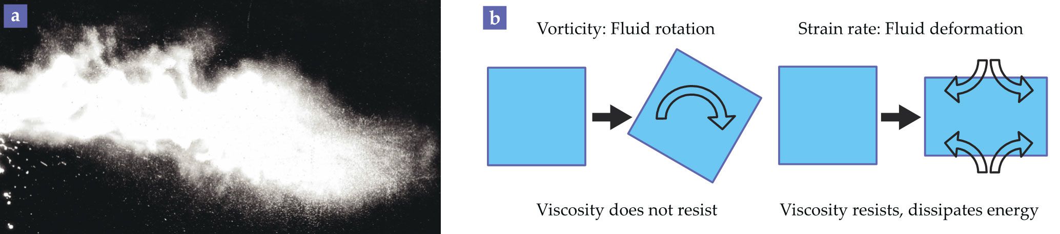 In the continuum approximation of fluid dynamics, a fluid particle is defined as an effectively infinitesimal volume of fluid at a specific location. In addition to the particle’s velocity, its dynamics is described by two quantities: the vorticity and the strain rate. The vorticity gives the rate at which a fluid particle at a given position is rotating. The strain-rate tensor describes the local rate at which a fluid particle is getting stretched and squeezed. In figure