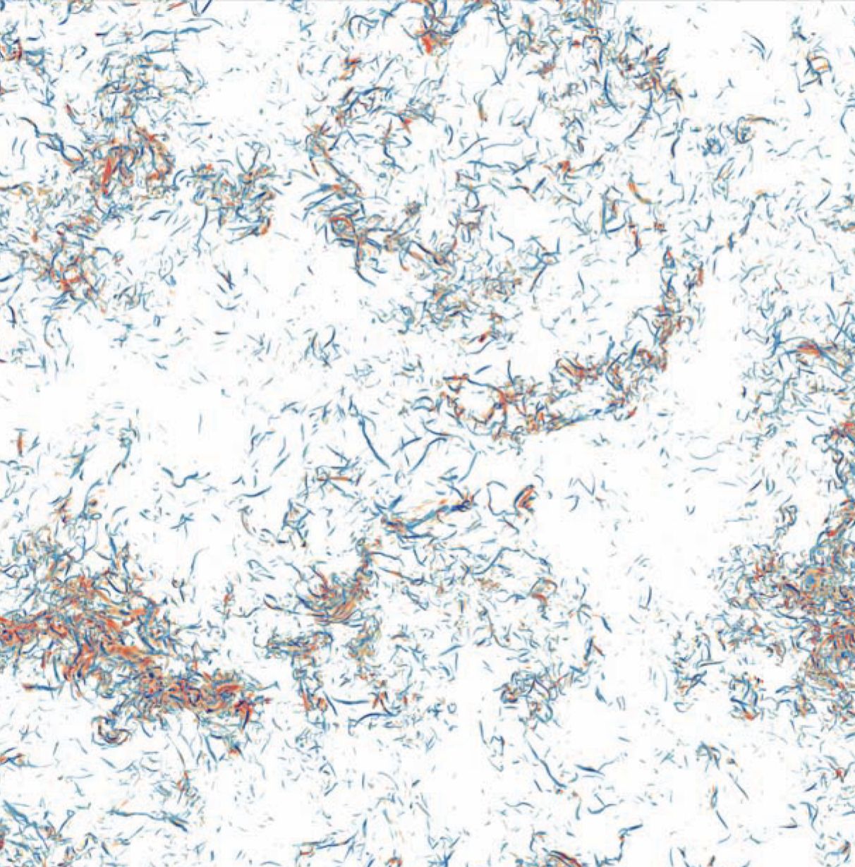 Stretching and rotating regions. In this turbulence visualization, most of the fluid has low activity, but certain regions are characterized by large-magnitude vorticity (blue) and large-magnitude strain rate (red). (From ref.