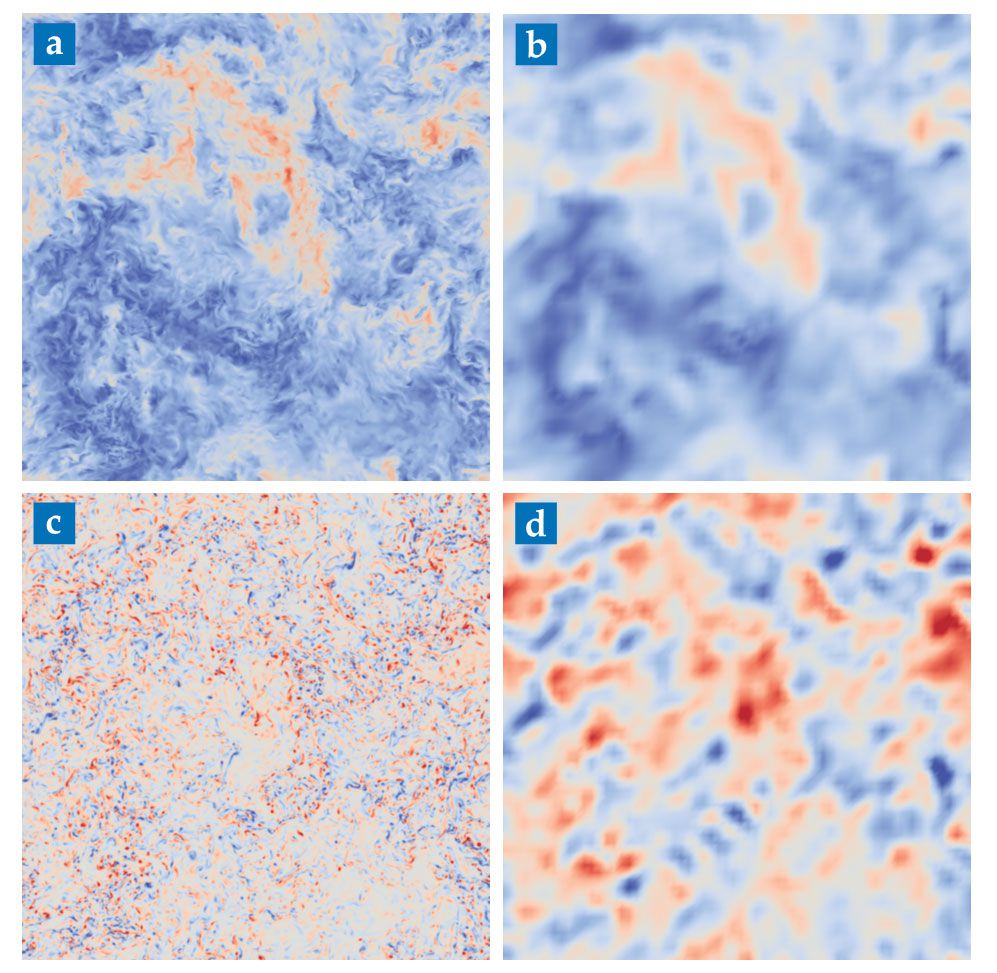 A stirred fluid simulated in a periodic box displays turbulence in its three-dimensional flow. (a) A 2D slice showing the magnitude of the flow’s velocity (red, high velocity; blue, low velocity) includes coherent motions of various sizes, including very small-scale features. (b) A technique called spatial filtering makes the simulation easier by sacrificing the resolution of small-scale motions. (c) The velocity gradient, typified by the vorticity seen here, reveals the smallest-scale motions in turbulence. (d) Spatially filtered vorticity, and by extension filtered velocity gradients, highlight motions at a chosen length scale. Filtered velocity gradients thus provide a basis for quantifying how energy passes between different scales.