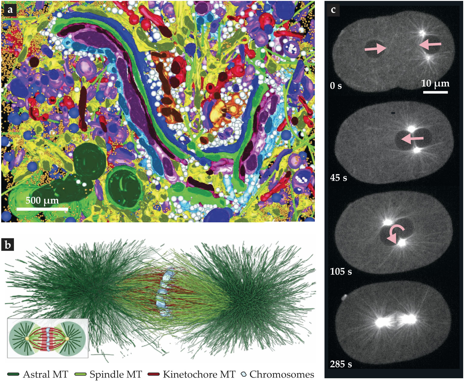 Complex components, structures, dynamics. This electron-tomography reconstruction (a) reveals the tightly packed composition of a 3-µm-wide region of a human pancreas cell. False colors indicate distinct classes of its organelles and cytoskeletal filaments. (Adapted from ref.