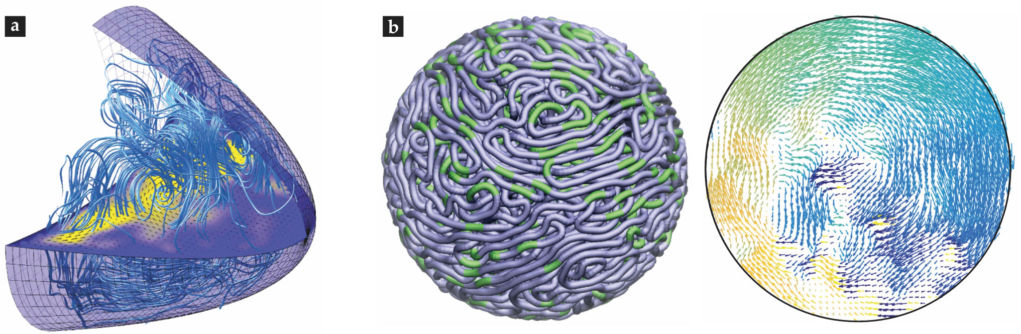 Simulating complex flows. (a) A computational model of flows driven by motors moving on microtubules in a Drosophila oocyte. (Courtesy of Jörn Dunkel; image adapted from ref.