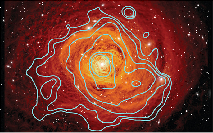 When a massive cold clump of baryons and dark matter grazed the central region of the Perseus cluster, spiral-shaped ripples formed in the intracluster medium (ICM; orange, filtered from x rays). The image covers 400 000 parsecs; courtesy of Stephen Walker, NASA’s Goddard Space Flight Center. The bright white patches show starlight from the cluster galaxies; they were observed with a 660 nm wavelength image from the Sloan Digital Sky Survey. Contours outline the corresponding synchrotron radiation from the relativistic plasma; courtesy of Marie-Lou Gendron-Marsolais, University of Montreal.
